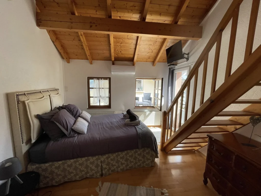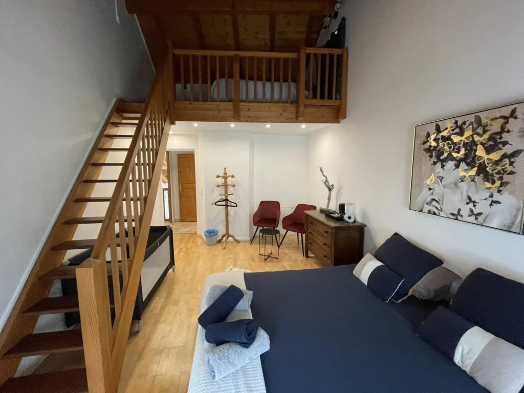 Un deuxième couchage en mezzanine vient compléter l’espace et apporte une touche chaleureuse et conviviale, parfaitement adaptée aux familles avec enfants ou aux petits groupes.