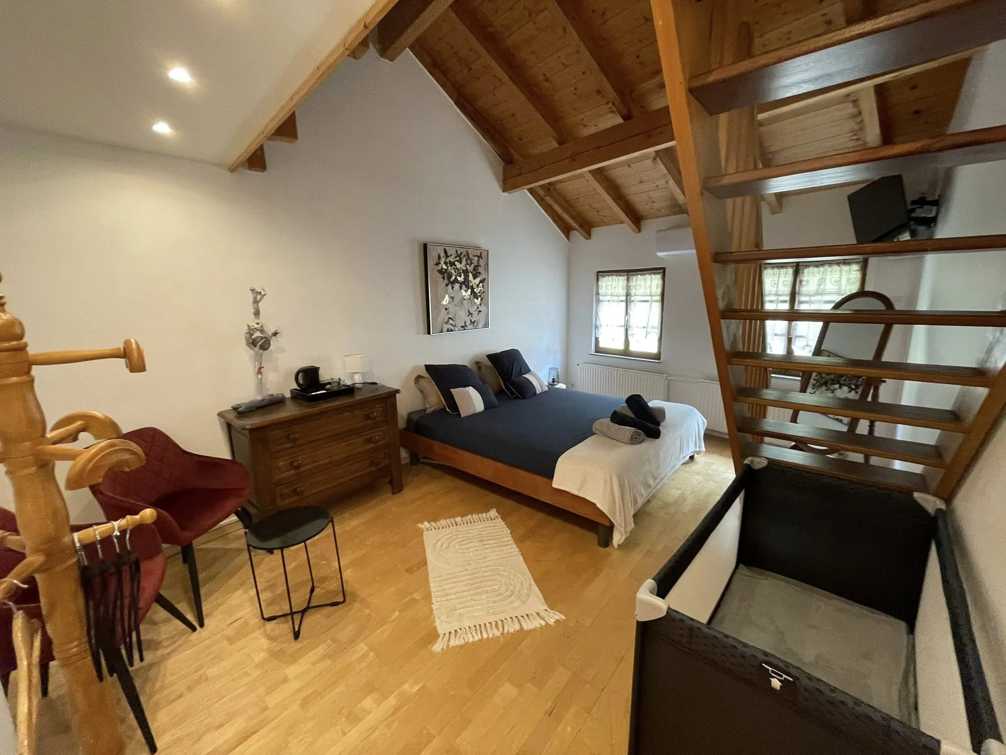 Un deuxième couchage en mezzanine vient compléter l’espace et apporte une touche chaleureuse et conviviale, parfaitement adaptée aux familles avec enfants ou aux petits groupes.